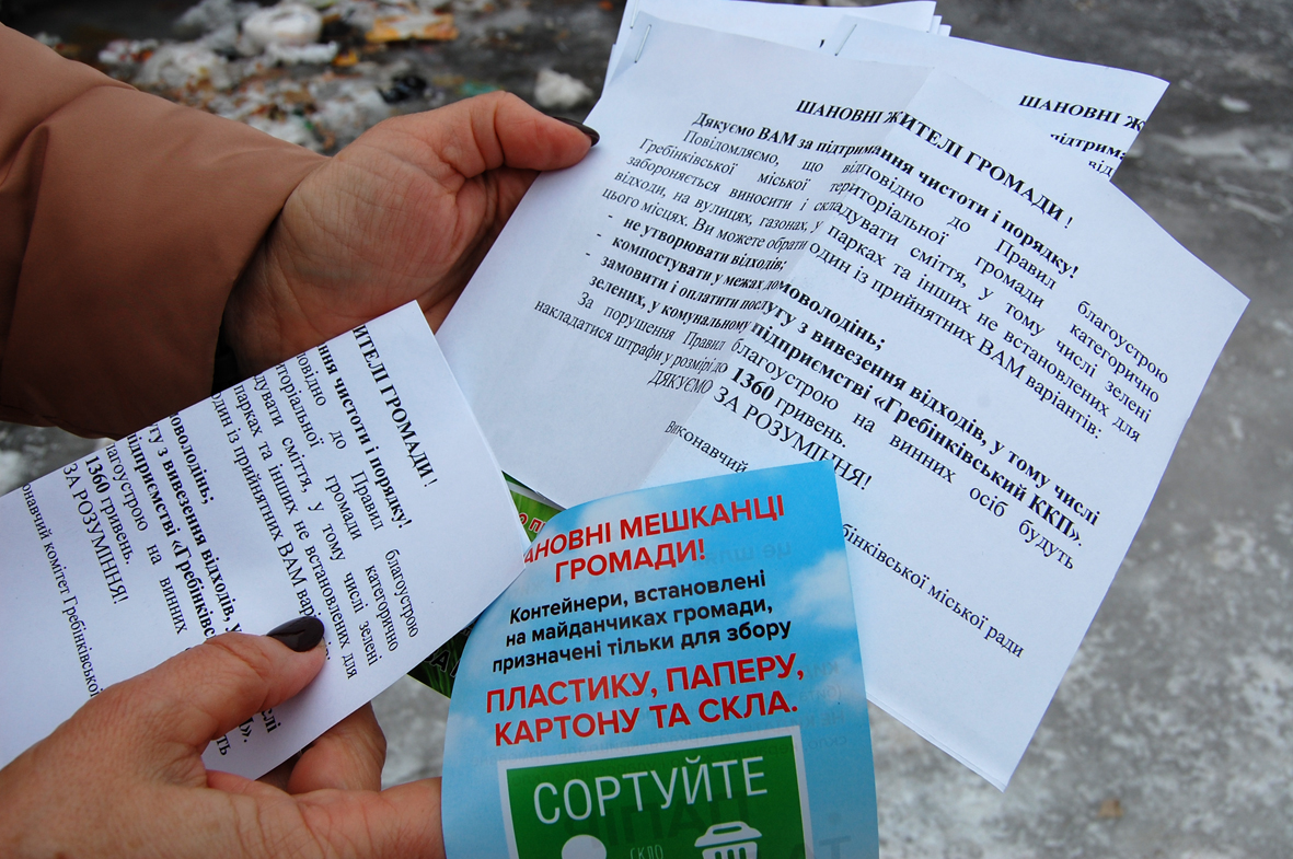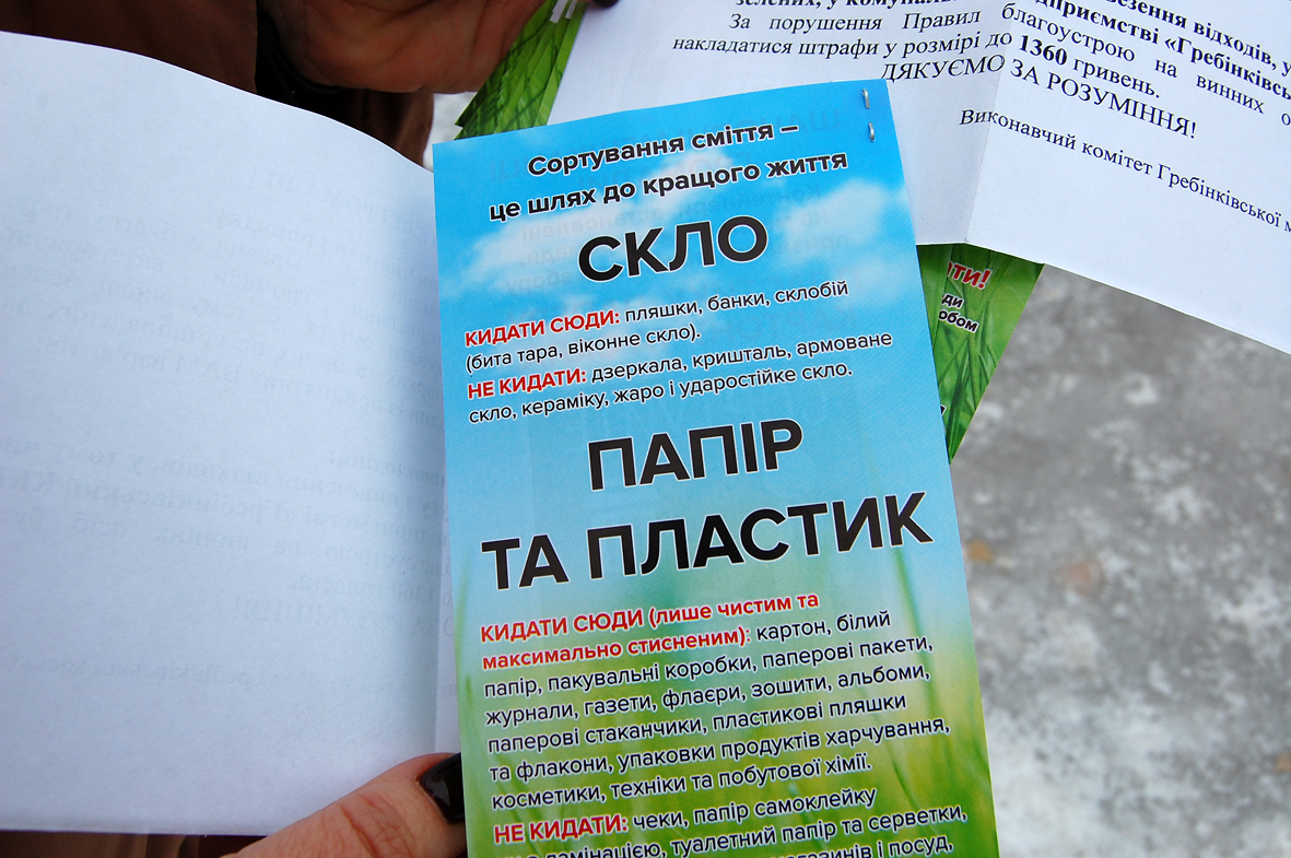 Декілька місяців тому було прийнято рішення закрити контейнери для роздільного збору відходів та залишити лише невеликі отвори — саме для того, щоб у контейнери могли потрапляти лише ті відходи, які підлягають сортуванню (пластик, картон, папір, скло). Для інших, так званих змішаних (мокрих) побутових відходів, працює інший алгоритм: у визначений час приїздить спеціалізована машина КП “Гребінківський комбінат комунальних підприємств”, яка збирає сміття безпосередньо від мешканців та транспортує його одразу на паспортизоване сміттєзвалище.